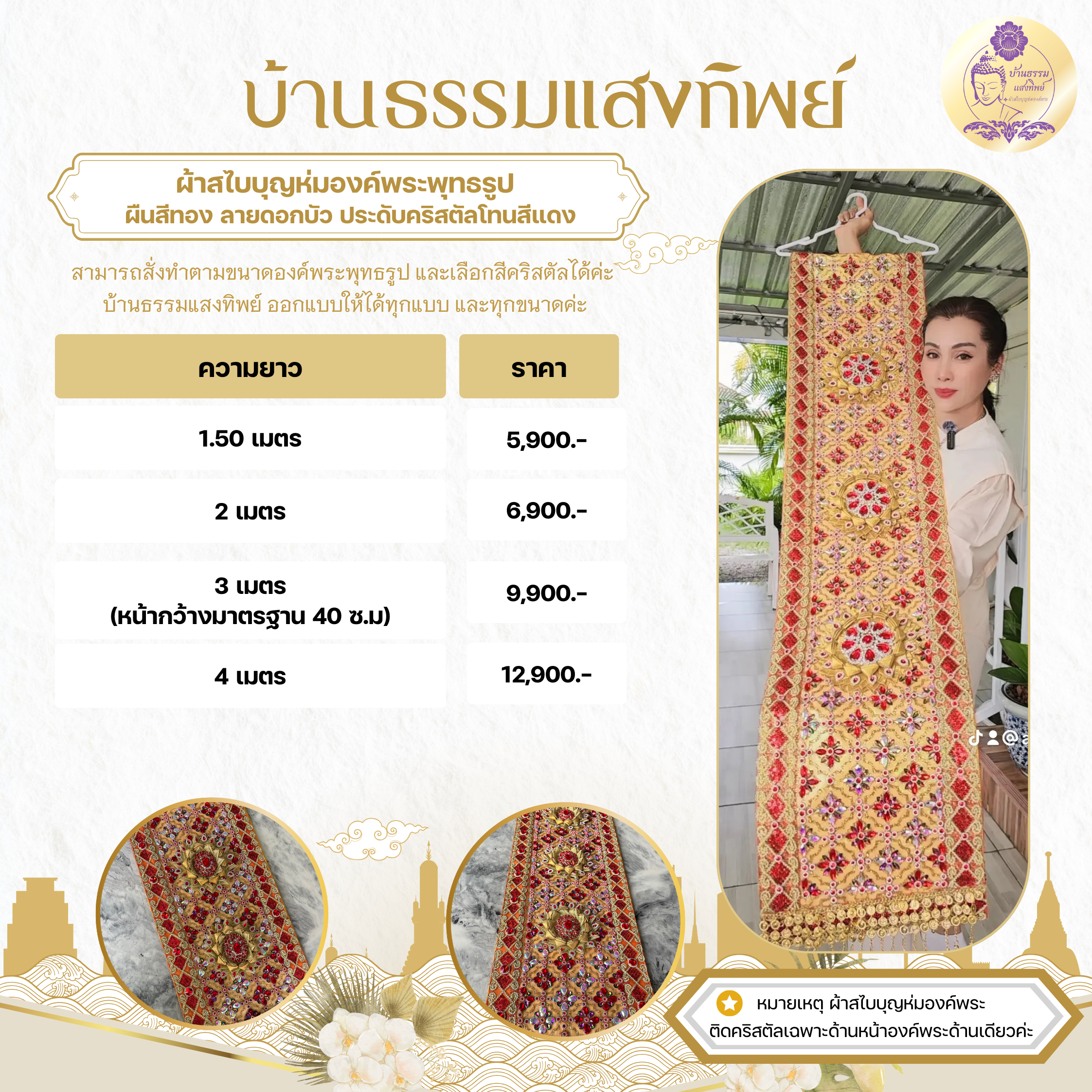 ผ้าสไบบุญห่มองค์พระ ผืนสีทอง ลายดอกบัว ประดับคริสตัลโทนสีแดง