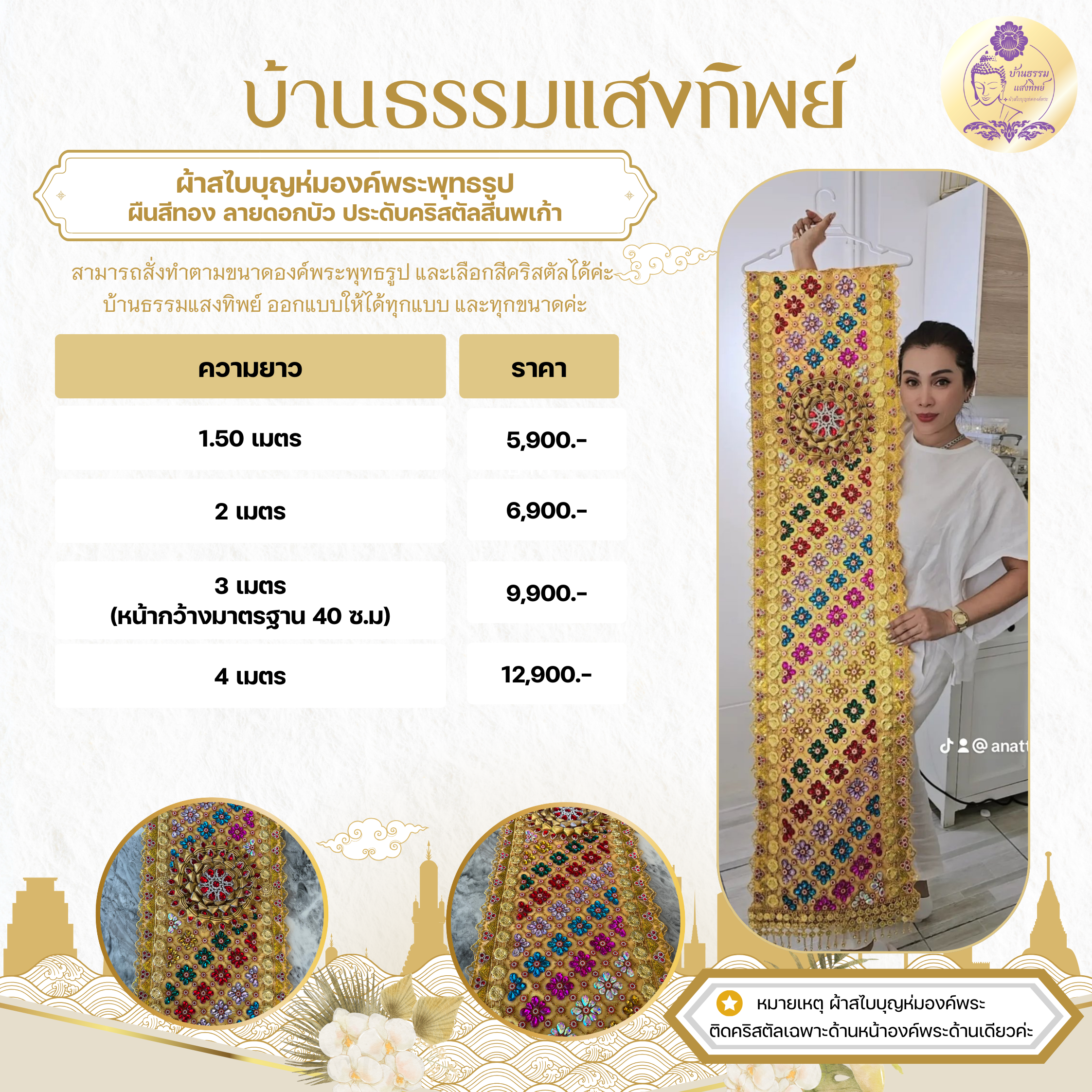 ผ้าสไบบุญห่มองค์พระ ผืนสีทอง ลายดอกบัว ประดับคริสตัลสีนพเก้า