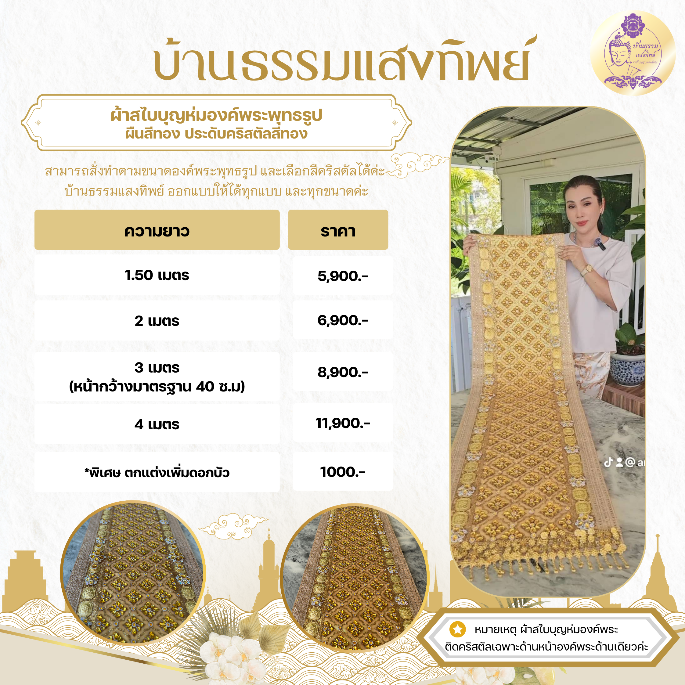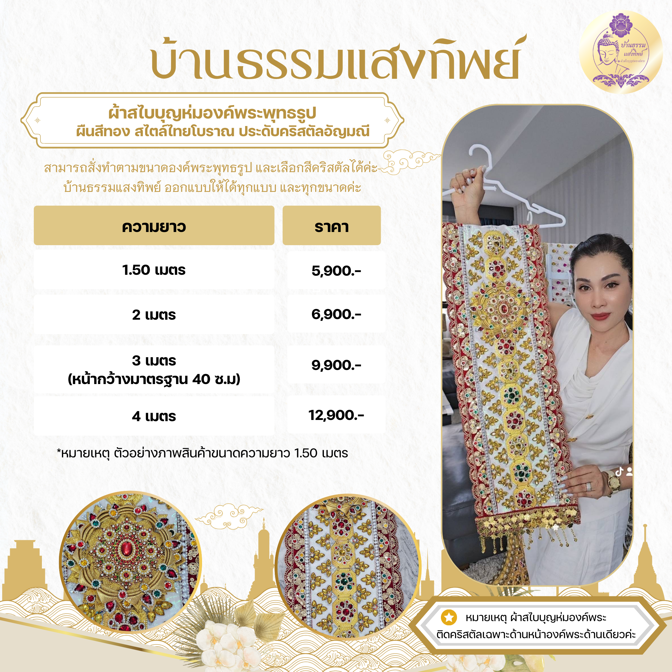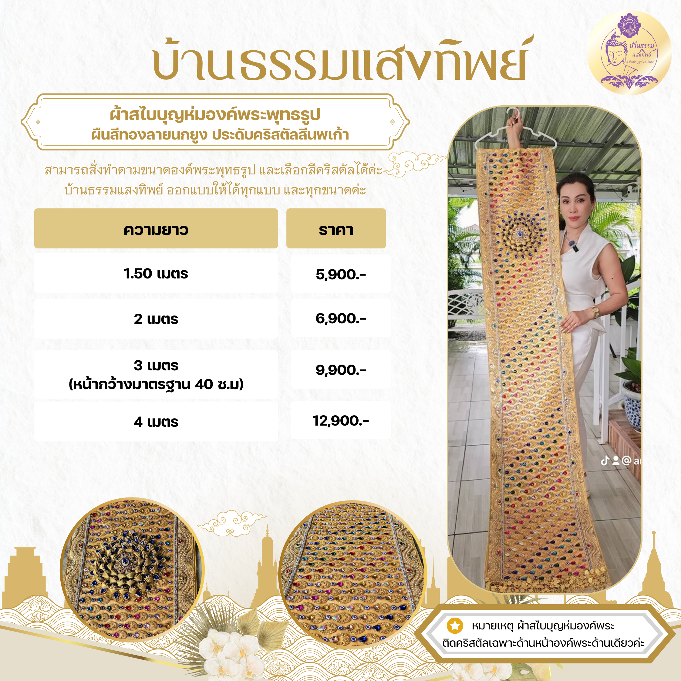 ผ้าสไบบุญห่มองค์พระ ผืนสีทองสไตล์ไทยโบราณ ประดับคริสตัลสีอัญมณี