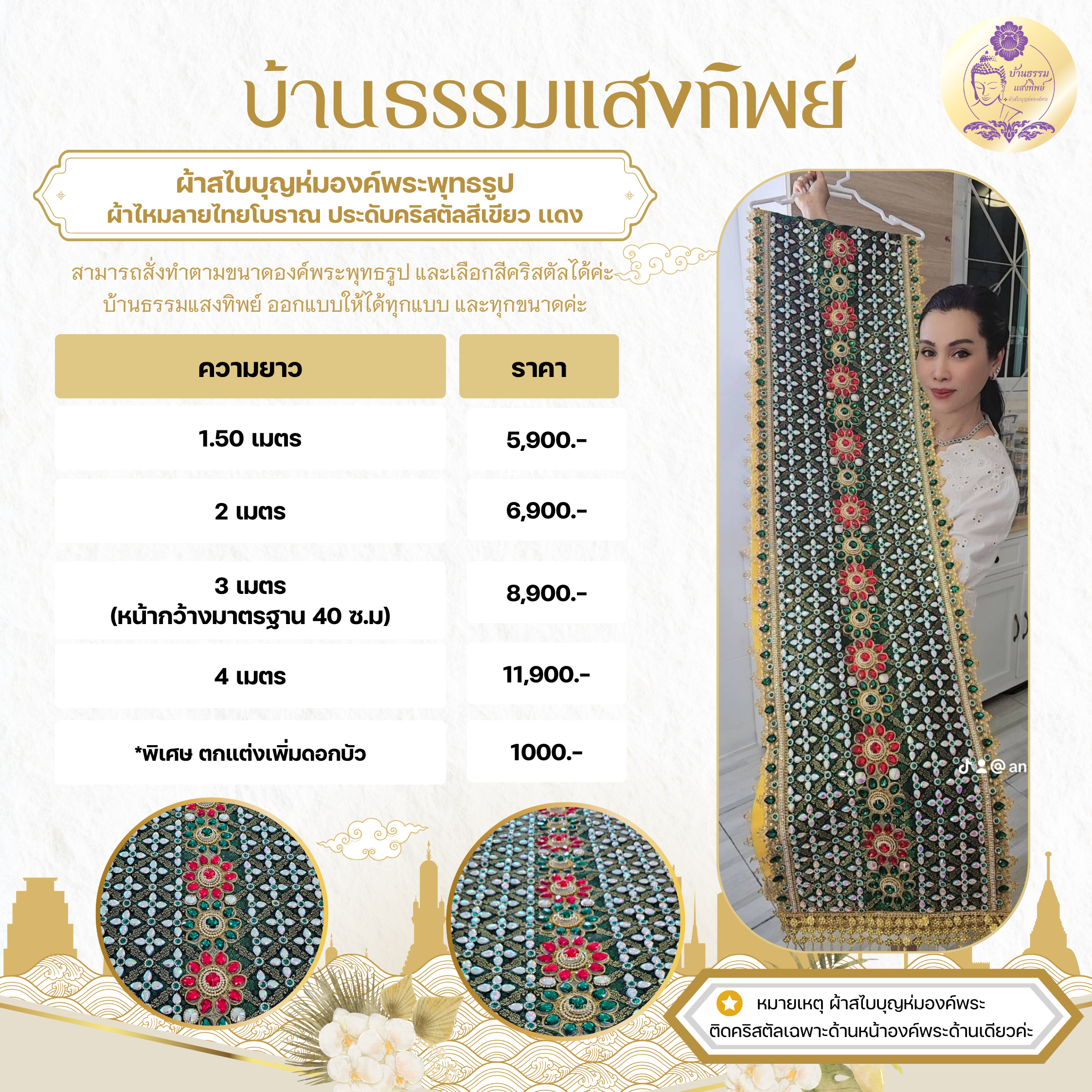ผ้าสไบบุญห่มองค์พระ ผ้าไหมลายไทยโบราณ ประดับคริสตัลสีเขียว เเดง