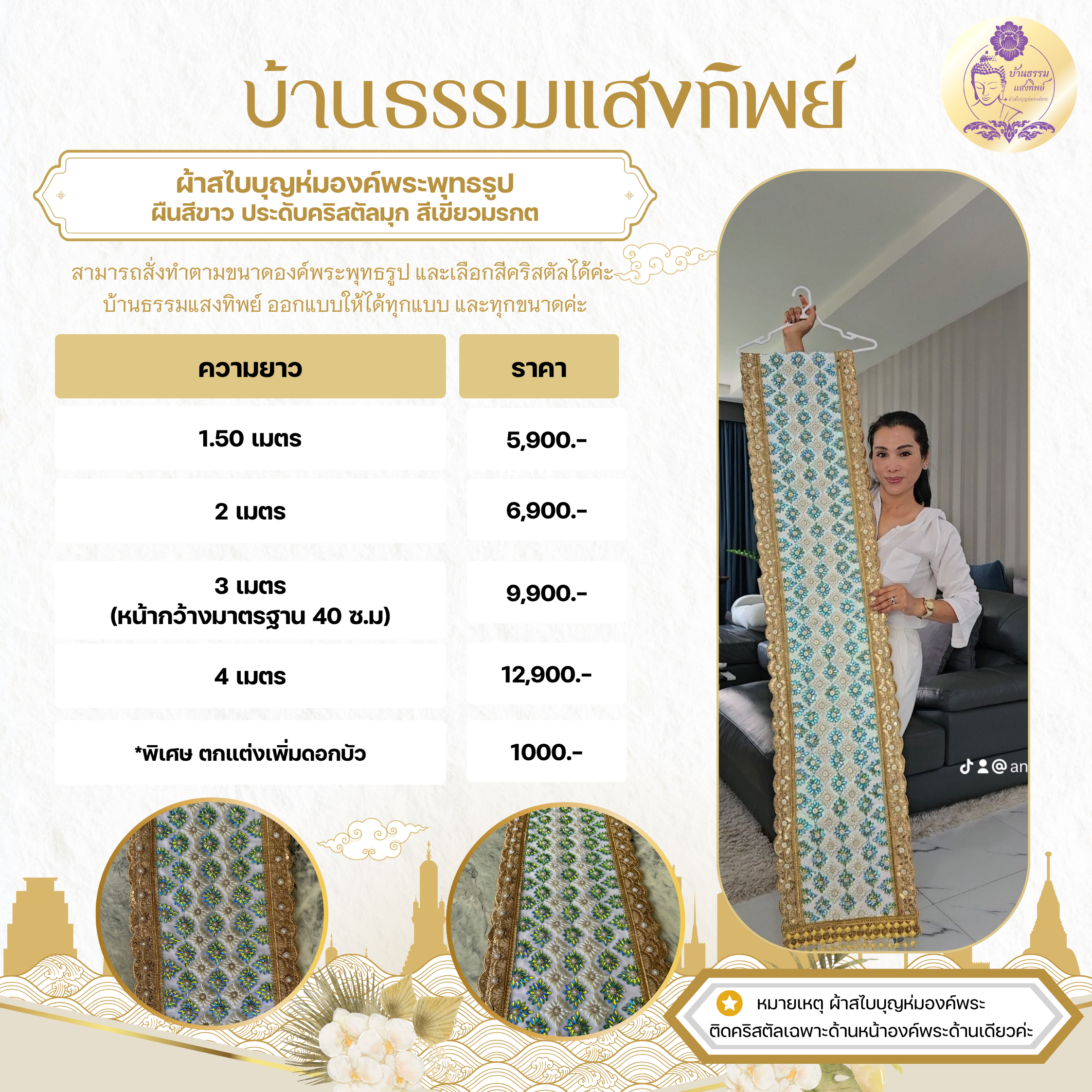 ผ้าสไบบุญห่มองค์พระ ผืนสีขาว ประดับคริสตัลมุขสีเขียวมรกต