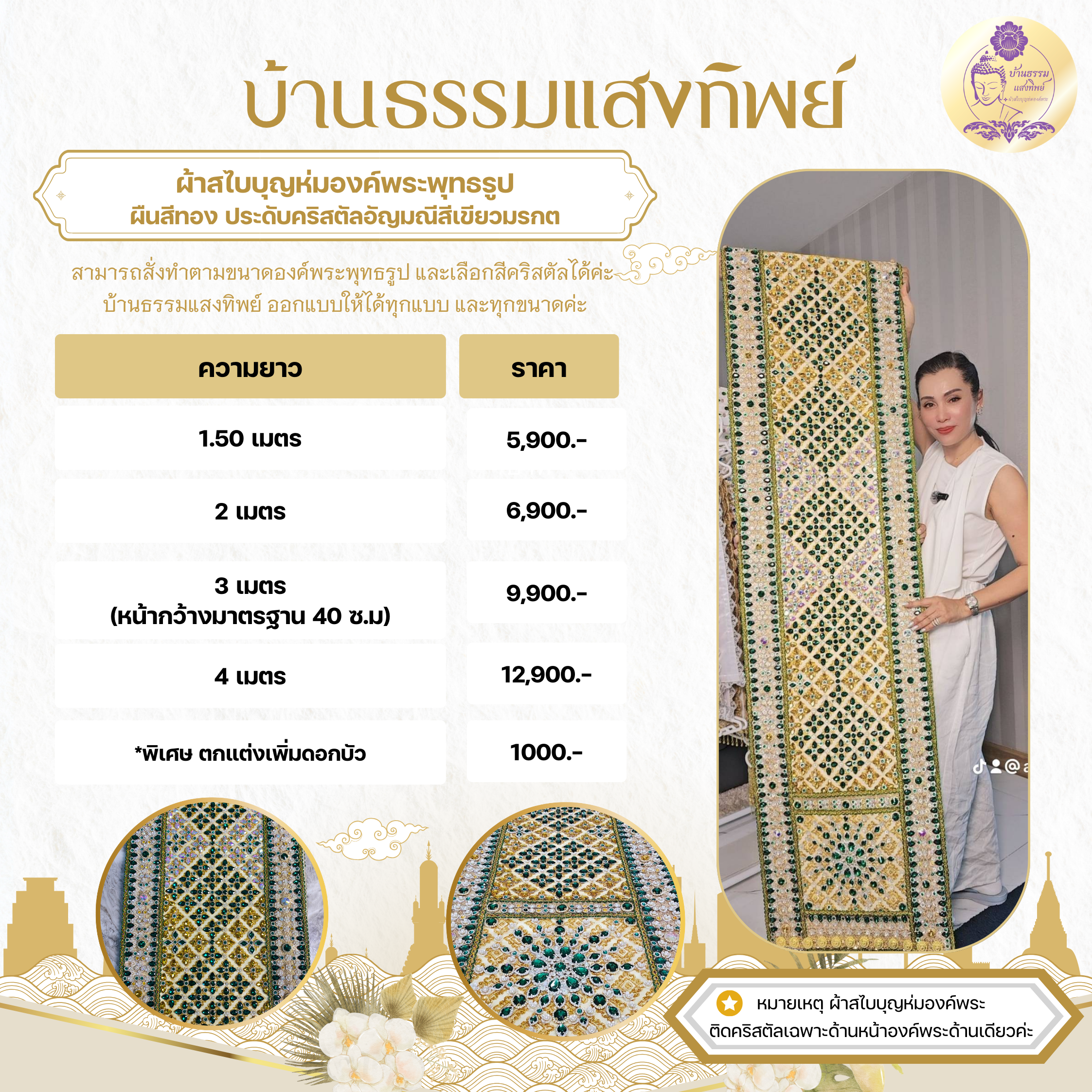 ผ้าสไบบุญห่มองค์พระ ผืนสีทอง ประดับคริสตัลอัญมณีสีเขียวมรกต