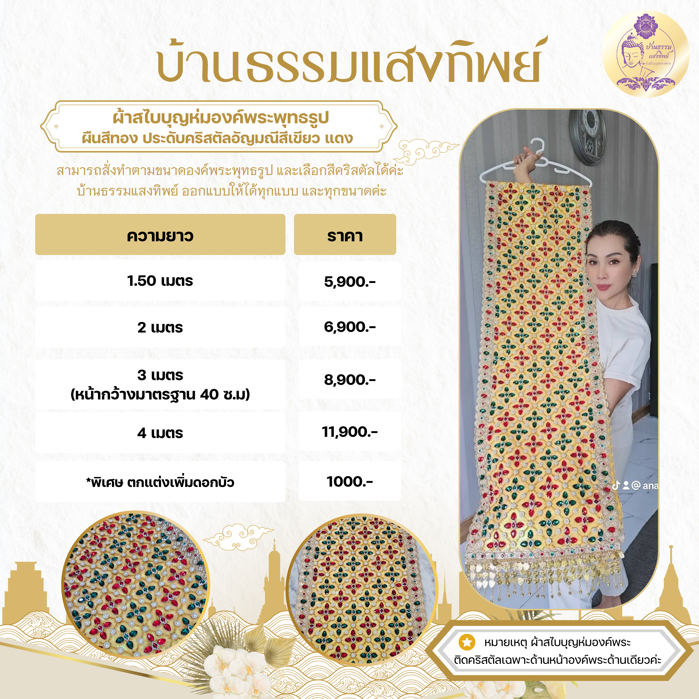 ผ้าสไบห่มองค์พระ ผืนสีทองประดับคริสตัลสีเขียวแดง