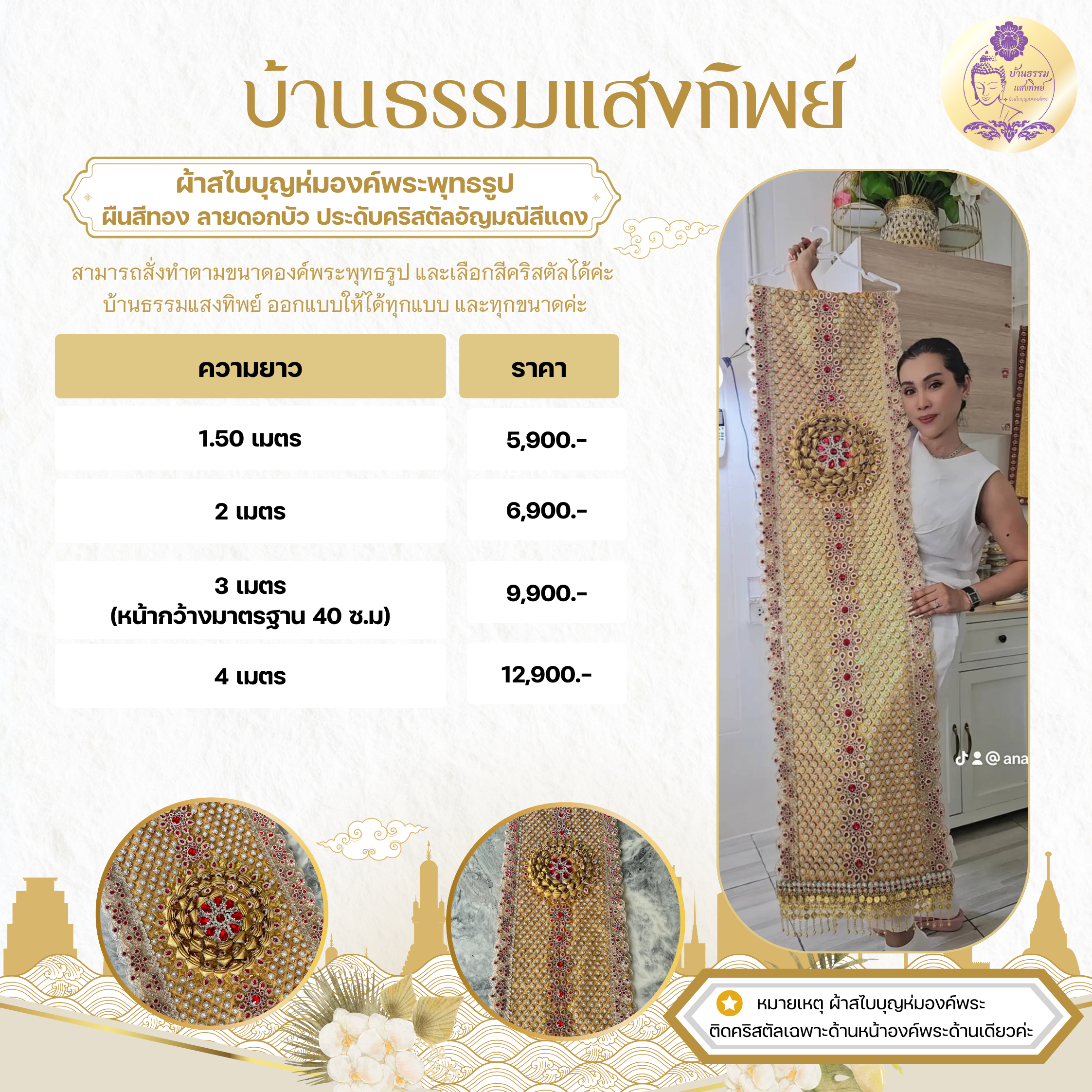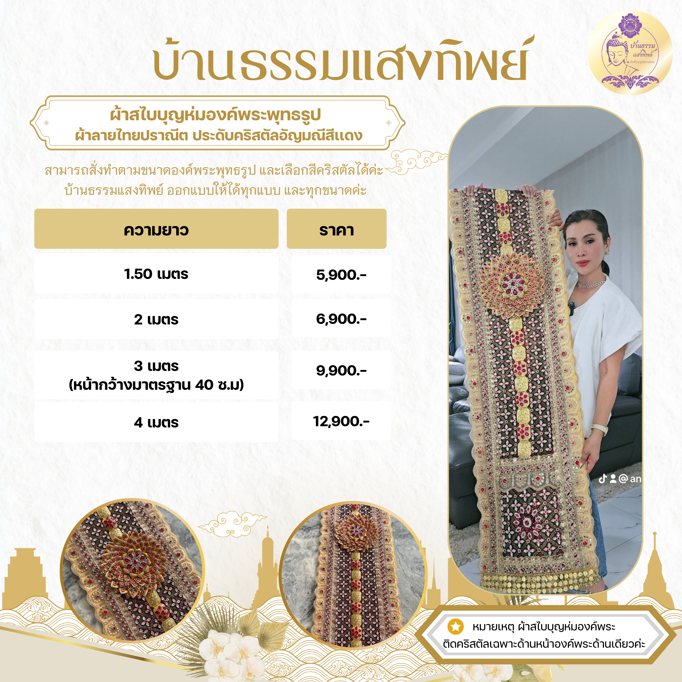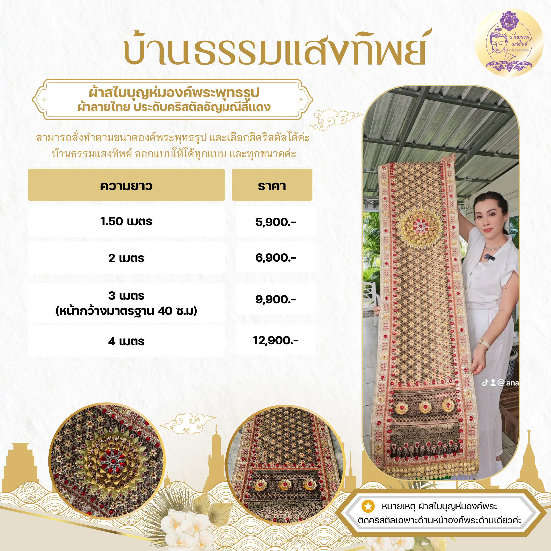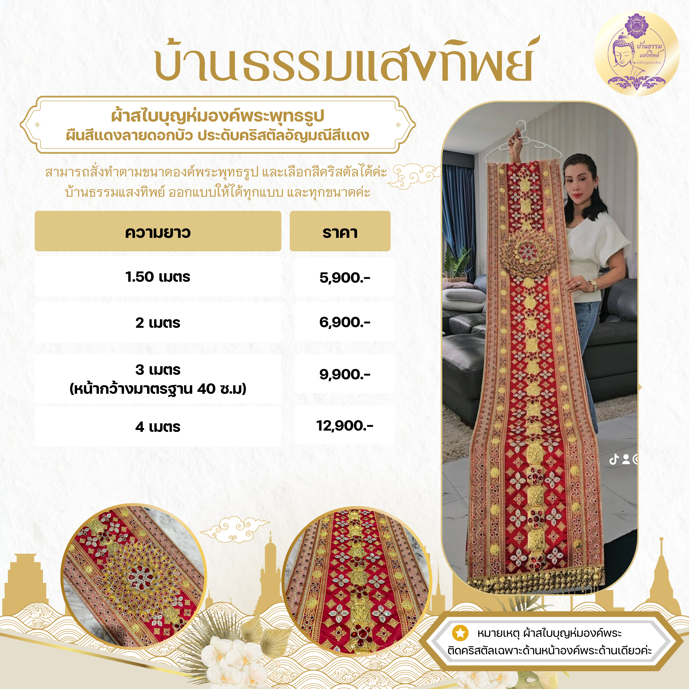 ผ้าสไบบุญห่มองค์พระ ผ้าลายไทยปราณีต ประดับคริสตัลอัญมณีสีแดง