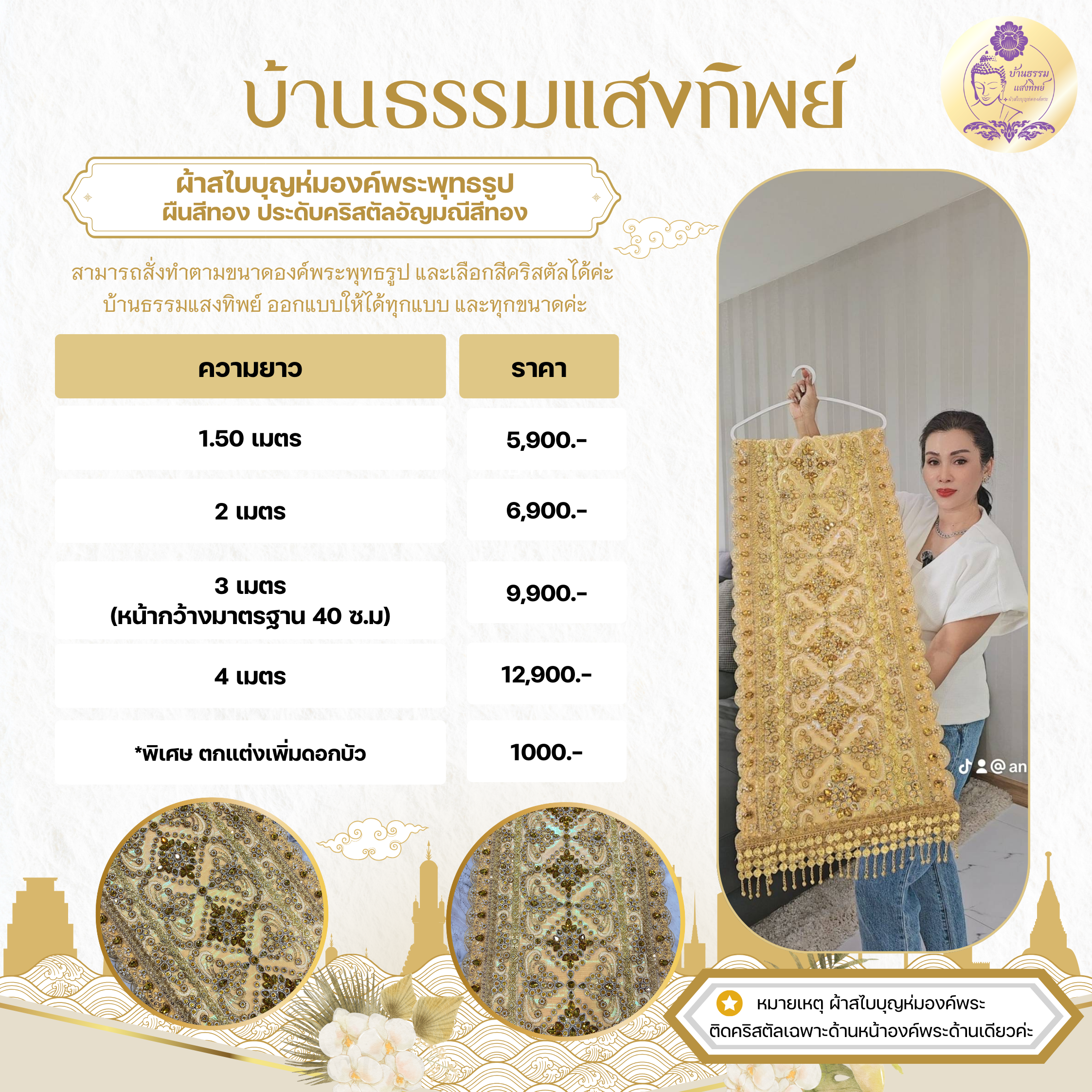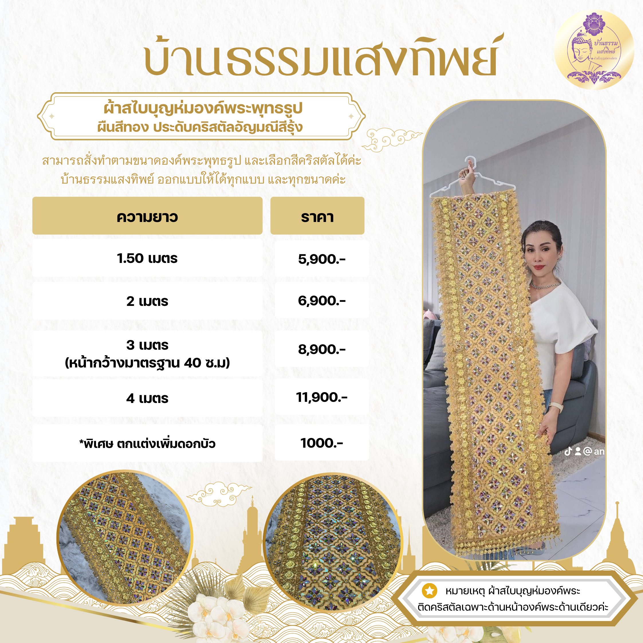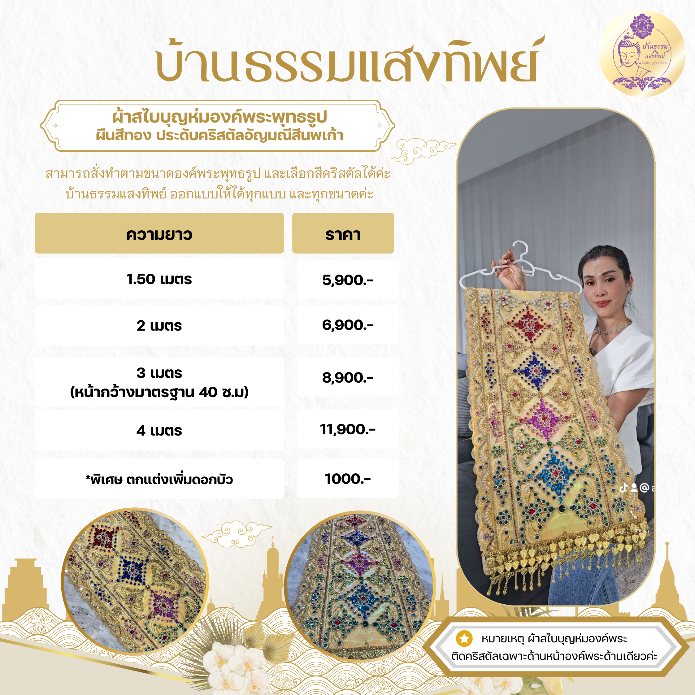 ผ้าสไบบุญห่มองค์พระ ผืนสีทอง ประดับคริสตัลอัญมณีสีรุ้ง