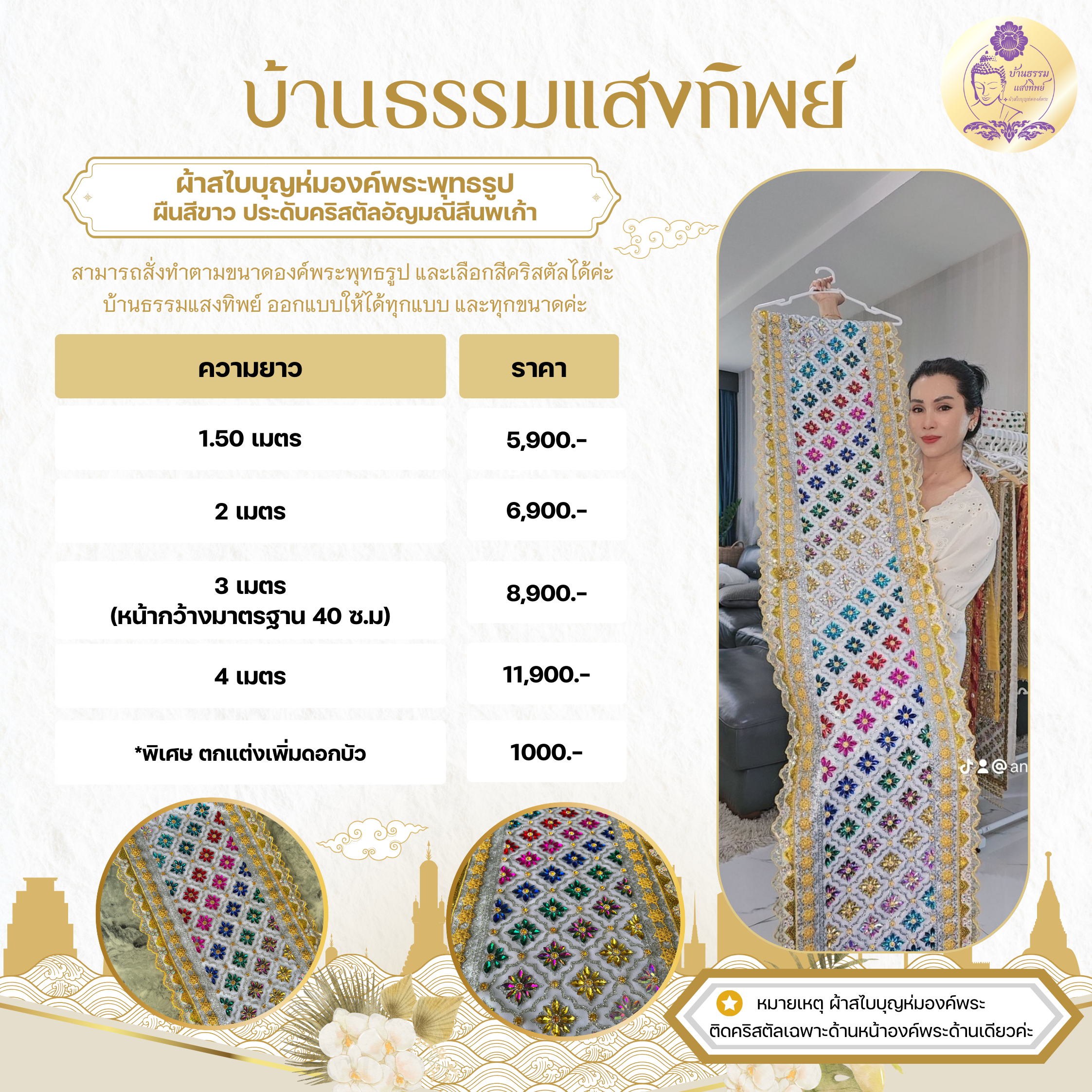 ผ้าสไบบูญห่มองค์ ผืนสีขาว ประดับคริสตัลอัญมณีสีนพเก้า