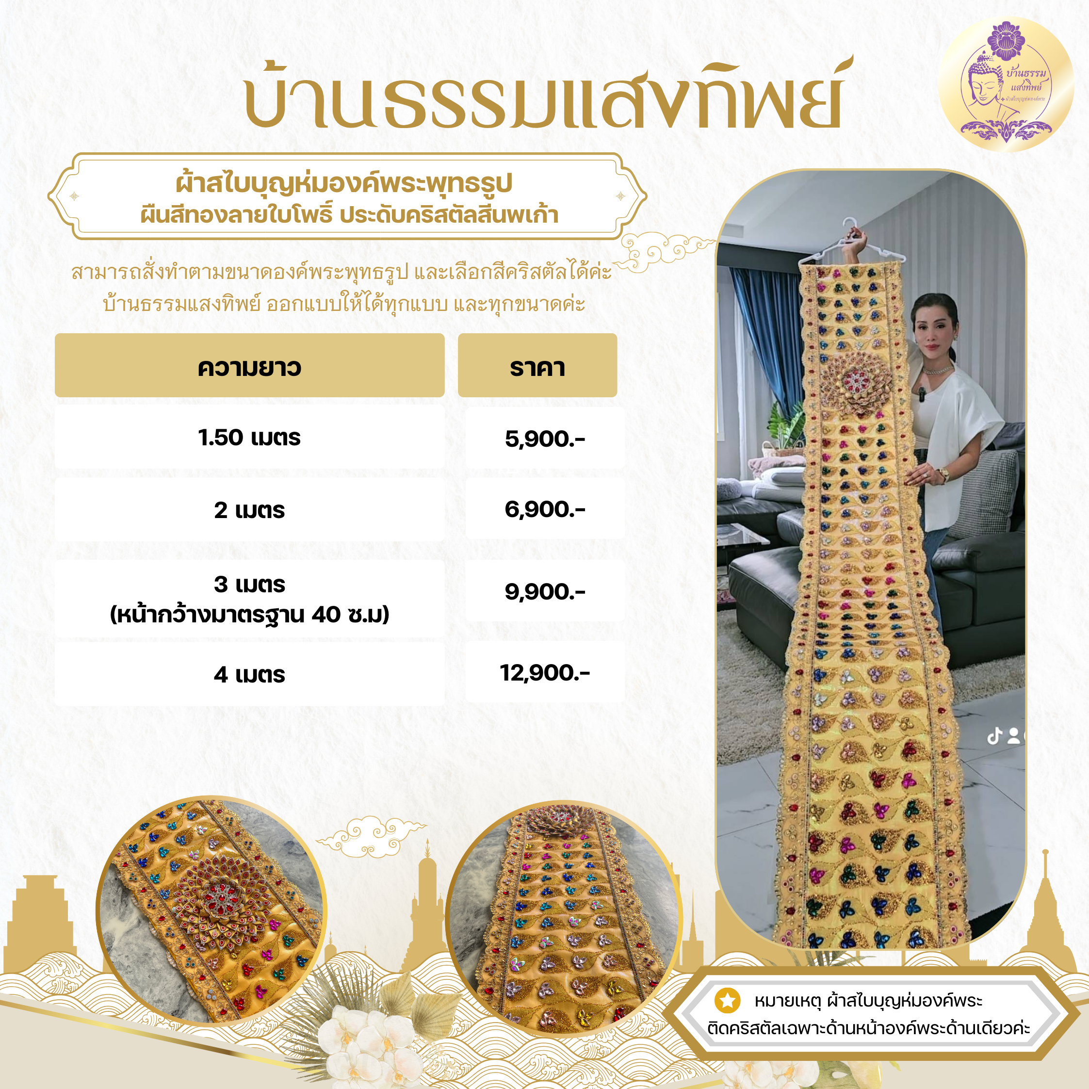 ผ้าสไบห่มองค์พระ ผืนสีทอง ประดับคริสตัลอัญมณีสีนพเก้า